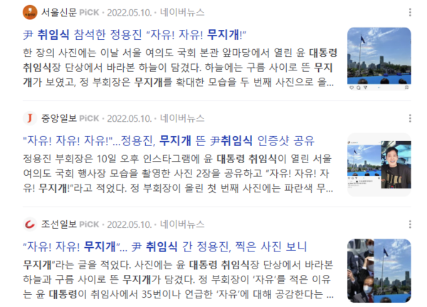 윤석열에 대한 언론의 미화·찬양·신격화 보도는 참으로 다양했다. 취임식 날 하늘에 뜬 무지개에 특별한 의미를 부여하는 주류언론들의 기사가 쏟아졌다。종편방송에서는 대놓고 “아주 상서로운 그런 무지개가 떴고”(MBN 백운기 앵커) “대한민국에 서광이 비친 것 같다. 상서로운 기운이 윤석열 정부의 첫날을 이렇게 축하했다”(최수영 대통령직인수위 전문위원)고 말했다. 박근혜 대통령에게 “형광등 100개를 켜놓은 듯한 아우라”라고 했던 TV조선이 떠오른다. 최수영 전문위원은 지금도 YTN 등 방송에서 정치평론을 하고 있다. ‘취임식 무지개 타령’을 했던 기자들과 정치평론가들에게 묻고싶다. ‘상서로운 무지개’의 결과는 혹시 나라를 통째 뒤엎을 뻔한 12.3 비상계엄 내란이었는가?