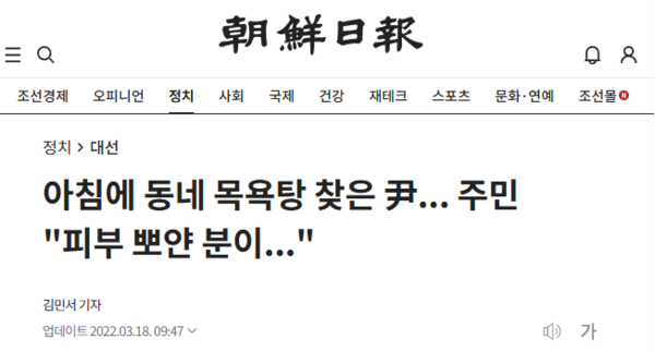 윤석열의 ‘뽀얀 살결’ 기사는 우상화 보도의 압권 중 압권이다. 윤 당선자가 대중목욕탕을 이용한 장면을 목격했다는 한 변호사가 SNS에 글을 올렸다. 이 글을 인용해 “아침에 동네 목욕탕 찾은 윤...주민 ‘피부 뽀얀 분이’”라는 제목의 기사가 조선일보·중앙일보·동아일보 등 여러 주류언론에 보도됐다. (동아일보 기사는 현재 온라인에서 삭제된 상태다. 창피해서 그랬을까.) 아마 이 기사를 보고 구역질이 난 독자도 있었을 것이다.
