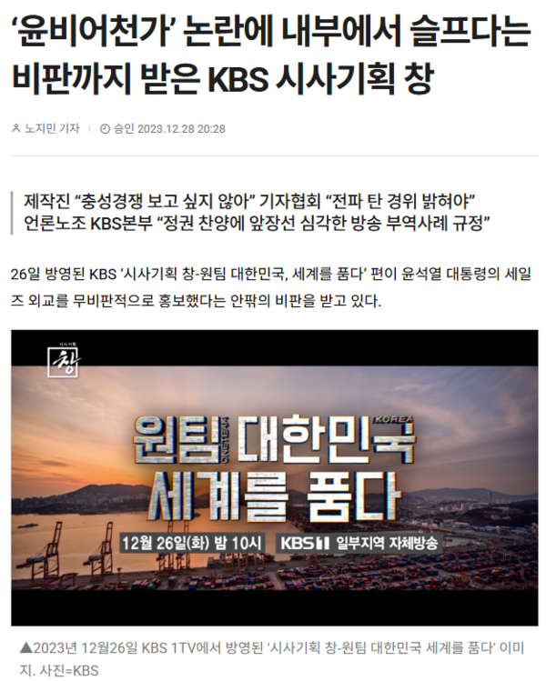 같은날 MBN도 “제20대 대선 특집 윤석열, 국민이 부른 내일의 대통령”이란 제목의 46분 특별편성 프로를 방영했다. 윤석열의 친구, 동창, 국힘당의 친윤 의원들이 출연해 윤석열 ‘신화’를 쓴 방송이었다. ‘땡윤방송’으로 전락한 KBS는 윤석열 2년차 연말 ‘시사기획 창-원팀 대한민국, 세계를 품다’ 제목의 방송에서 윤석열 대통령의 세일즈 외교 성과를 한껏 추켜세우며 스스로 ‘국정홍보 방송’임을 증명했다. 이듬해 초 박장범 앵커는 윤석열을 만나 김건희 씨가 받은 명품백을 ‘작은 파우치’로 축소하고 결국 KBS사장에 올랐다.
