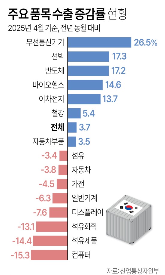 내수경기 침체 장기화에 윤석열 내란 사태까지 겹치며 올해 1분기 우리 경제는 마이너스 성장을 피하지 못했다. 지난달부터 트럼프 발 관세전쟁으로 자동차와 철강 등 주력 제품의 수출도 감소 추세로 돌아섰다. 대미 수출도 역주행하기 시작했다. 산업통상자원부는 1일 발표한 4월 수출입 동향 자료를 보면 대미 수출은 지난해 같은 기간보다 6.8% 감소한 106억 달러로 집계됐다. 반도체와 함께 양대 수출 품목인 자동차는 65억 달러로 작년 동기 대비 3.8% 줄었다. 다만 반도체 수출 호조에 힘입어 지난달 수출은 전년 동월 대비 3.7% 증가한 582억 1000만 달러를 기록했다.
