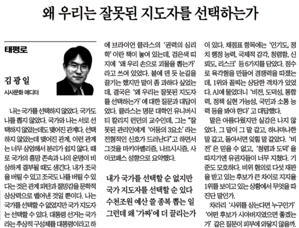김 씨가 언급한 ‘권력의 심리학’이란 책을 읽고 있다. 그는 그 책을 읽고 ‘왜 우리는 잘못된 지도자를 선택하는가?’라는 질문을 떠올린 것으로 보인다. 그에 대한 답은 멀리 있지 않다. 여전히 숨통을 끊어야 할 내란의 끝을 잡고 선동질에 광분하고 있는 이른바 K-엘리트 등을 ‘처단’하면 된다. 그들을 생산해 낸 사회구조를 척결하면 된다. ‘잘못된’을 넘어 ‘나쁜’도 모자라 ‘사악한’ 지도자를 뽑아내는 구조 한가운데 은거하는 범죄집단 방씨조선일보를 끝장내면 된다.