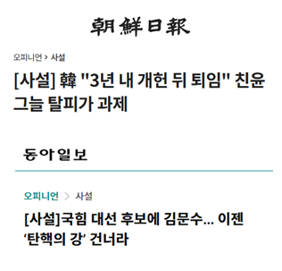 “한 출마, 국힘 후보 3일 결정...덧셈 아닌 비전으로 단일화”(동아) “한덕수 출마로 시동 건 단일화, 가치연대로 판단 받아야”(매경), “한덕수 전 총리 임기단축 개헌공약, 공론화 계기돼야”(한경) 등 주요 ‘보수 매체’들은 한덕수 권한대행의 사퇴와 대선 출마를 이렇게 기다렸다는 듯 환영하며 격려와 응원을 보냈다.