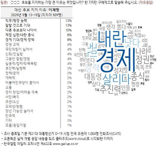 이재명을 지지하는 사람들에게 그 이유를 물은 결과(509명, 자유응답) '직무/행정 능력', '잘할 것으로 기대'(이상 13%), '다른 후보보다 나아서'(10%), '계엄 심판/내란 종식', '경제 기대/경제 정책'(이상 8%), '정권 교체', '국민의힘이 싫어서', '신뢰/진실함', '그동안 잘함/경험', '실용적/합리적/똑똑함'(이상 4%) 등 경험과 역량에 기반한 국정 기대감, 내란 종식 관련 언급이 많았다.