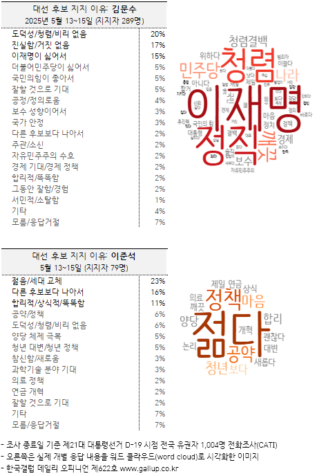 김문수 지지자(289명, 자유응답)는 '도덕성/청렴/비리 없음'(20%), '진실함/거짓 없음'(17%), '이재명이 싫어서'(15%), '더불어민주당이 싫어서', '국민의힘이 좋아서', '잘할 것으로 기대'(이상 5%), '공정/정의로움'(4%) 등 청빈함을 비롯한 개인 자질이 주를 이뤘고, 이재명에 대한 반감도 드러냈다.