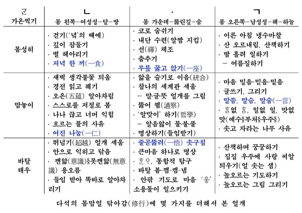 다석의 ‘오늘살이’는 몸맘얼을 닦아가는 삶이었다. 그는 저녁 한 끼를 먹는 일식(一食), 무릎을 꿇고 앉는 일좌(一座), 가난한 이들에게 어진 나눔을 실천하는 일인(一仁), 말씀을 터 말숨을 나누는 일언(一言), 줄곧 뚫려 솟구치는 일오(一吾)의 삶을 살았다. 위에 정리한 얼개는 그런 몸맘얼 닦기가 삶에 얼마나 촘촘히 녹아들었는지를 보여준다. 몸맘얼 닦기로 깨친 생각들은 고스란히 한글 시에 담겨 있다.