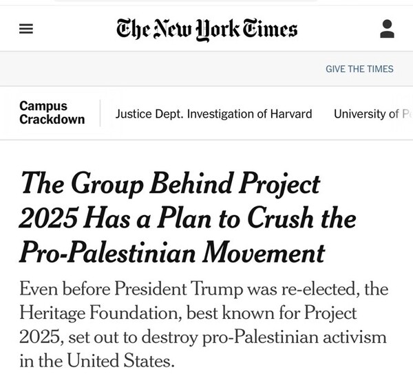 '프로젝트 에스더'(Project Esther)로 불리는 이 작업은 도널드 트럼프 대통령이 재선되기도 전에 착수한 것으로 확인됐다. 뉴욕타임스(NYT)는 '프로젝트 2025의 배후 그룹, 친팔레스타인 운동 파괴 계획'이란 18일 자 기사에서 이 같은 내용을 폭로했다.