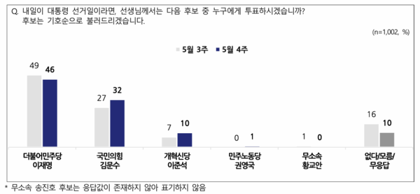 선호도, 이재명 46% 김문수 32% 이준석 10%