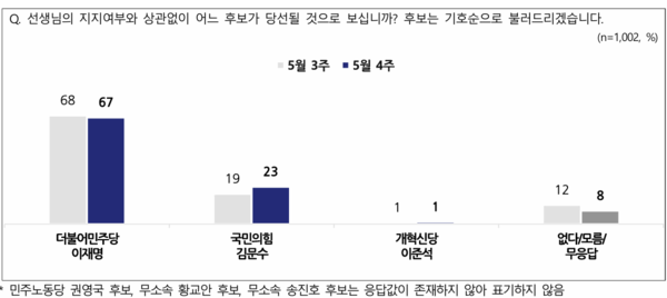 대통령 후보 인물에 대한 호감 여부도 지지도와 비슷한 결과(‘호감이 간다’: ‘이재명’ 46%, ‘ 김문수’ 33%)를 나타냈으나, 차기 대통령 선거에서 ‘정권교체를 위해 기존 야권 후보가 당선되어야 한다’고 응답한 비율이 55%, ‘정권재창출을 위해 기존 여권 후보가 당선되어야 한다’고 응답한 비율이 34%로 나타났고, 당선 전망에서는 ‘이재명’이 67%로 ‘김문수’(23%)를 44%p 차로 압도했다. ‘이준석’은 1%.