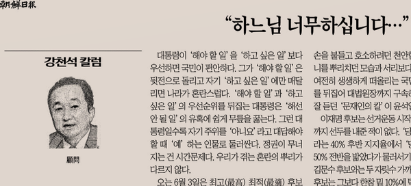 “우리는 박근혜 탄핵 땐 문재인을 보내시고 윤석열 탄핵 땐 이재명을 보내신 하느님께 감사 말씀을 올릴 수 있을까. 혹시 ‘하느님 너무하십니다’로 시작하는 원망(怨望)의 편지를 띄우게 되지는 않을까.”