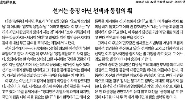 조선일보 "선거는 응징 아닌 통합"이란 허튼 주장