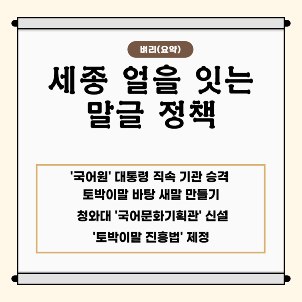 아직까지 우리나라에는 우리말을 제대로 북돋우며 가꾼 임금도 대통령도 없었습니다. 새 정부의 이재명 대통령은 문화 강국을 만들겠다는 다짐을 하고, 정부 이름 또한 ‘국민주권 정부’로 부르기로 했습니다. 그런 만큼 그에 걸맞게 세종 임금님의 얼을 잇는 첫 대통령으로서 나라의 임자인 나라 사람들이 옛날부터 써 온 ‘토박이말’과 우리 겨레의 자랑인 ‘한글’을 함께 챙기는 대통령이 됐으면 합니다. 이에 도움이 될 수 있는 말글 정책을 마련해 주시기를 아래와 같이 바랍니다.
