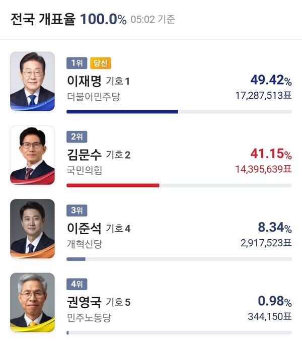 이변은 없었다. 내란은 마침내 진압됐고 민주주의가 승리했다. 이번 대선 결과는 선거운동에 들어가기 전에 이미 결정돼 있었다. 지난해 12.3 쿠데타라는 윤석열의 선제공격은 거꾸로 제2의 촛불혁명('빛의 혁명)을 불러냈다. 그리고 이어진 5개월 동안의 거대한 투쟁은 한국 사회를 뒤흔들었고, 이번 대선 결과도 결정했다.