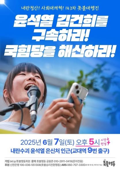 촛불승리전환행동(상임대표 김민웅)은 7일 오후 5시 서울 교대역 9번 출구 앞에서 '내란청산 사회대개혁 143차 촛불대행진'을 진행할 예정이다.