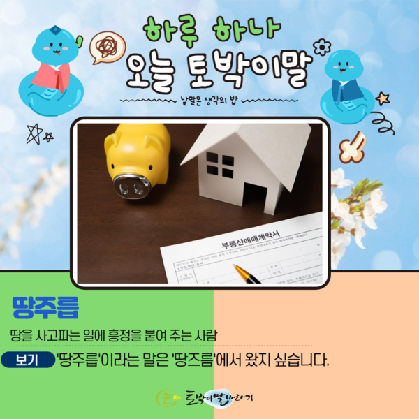 저는 이런 말을 보면 좀 갑갑합니다. '땅'은 누구나 잘 아는 말인데 '주릅'과 '사고파는 일에 흥정을 붙여 주는 일'이 잘 이어지지 않기 때문이지요. 어제 알려드린 '땅켜'는 '땅'과 '켜'를 더해 만든 말인 것을 얼른 알 수 있는 것과 달라서 그렇다는 것입니다.