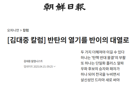 윤석열의 계엄을 가장한 내란 시도 행위는 불법이었고, 불법 행위에 대한 헌법재판소의 파면 결정에도 계엄이라는 용어를 고수하고 있는 방씨조선일보의 음흉한 속셈에 대한 심판도 국민이 내려줄 것이다. 방씨조선일보에서 평생 밥벌이를 해온 김대중이라는 사람은 ‘반탄의 열기를 반이의 대열로’라는 칼럼을 통해 반탄을 선동하는 주장을 했다. 탄핵을 반대하는 것은 내란을 옹호하며 민주공화국 대한민국의 정체성을 부정하는 반역 행위일 뿐이다.