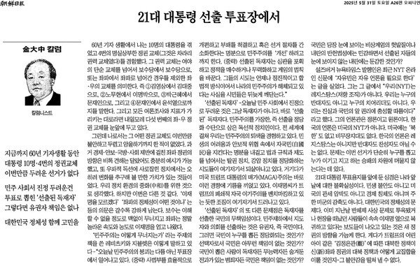 <어떻게 민주주의는 무너지는가>의 저자인 레비츠키와 지블렛은 ‘민주주의가 아무리 튼튼하다 해도 극단주의자는 어느 사회에나 있기 마련이며, 그런 인물이 당내의 주류가 되지 못하도록 그 정당이 자체적으로 차단하고, 그들에 대한 지지와 연합을 거부하고, 필요하면 다른 당의 민주주의자를 지지하거나 연대함으로써 그들이 권력을 잡지 못하도록 해야 한다’고 설파합니다. 저자들의 권고에 따르자면, 국힘당은 ‘극단주의자’ 윤석열이 대통령이 되지 않도록 막았어야 합니다. 그런데 조선일보의 대표 논객이라는 김대중 전 주필은 책의 내용을 곡해하여 ‘민주주의자’ 이재명이 대통령이 되지 못하게 막으라고 합니다. 저자들이 알면 무어라 할지 궁금해집니다. ‘극단주의자’ 윤석열을 ‘선출된 독재자’로 만든 건, 김대중 전 주필의 주장처럼 우매한 유권자들이 아니라 괴벨스가 울고 갈 선전 선동의 대국민 심리전으로 유권자들을 오도한 조선일보입니다.