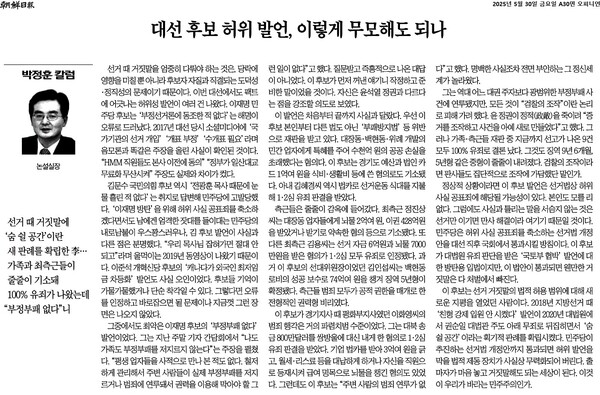 김대중 전 주필의 칼럼보다 하루 앞서 나온 박정훈 논설실장의 ‘대선 후보 허위 발언, 이렇게 무모해도 되나’라는 제목의 기명 칼럼은 이재명 후보를 악마화하며 배배 꼬인 조선일보의 속내를 거침없이 드러냅니다. 선거 때 거짓말을 엄중히 다뤄야 하는 것은 당락에 영향을 미칠 뿐 아니라 후보자 자질과 직결되는 도덕성, 정직성의 문제이기 때문이고, 이번 대선에서 최악의 거짓말은 이재명 후보의 ‘부정부패 없다’는 발언이며, 이재명 후보는 역대 어느 대권 주자보다 광범위한 부정부패 사건에 연루됐다고 단정합니다.