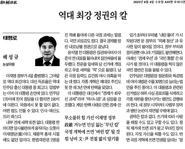 권력은 칼과 같아서 쓰기에 따라 사람을 해칠 수도 있고 구할 수도 있답니다. 정적 제거에 쓰면 피가 묻고 자칫 자신을 찌를 수도 있답니다. 은근한 협박입니다. 조선일보는 그런 협박성 충고를 대통령이던 윤석열에게도 했을까요? 저는 그런 비판을 본 기억이 없습니다. 칼은 칼집에 있을 때 더 강하답니다. 칼을 쓰지 말라는 것인데, 그런 식의 속 보이는 꼬드김에는 초딩들도 넘어가지 않습니다.