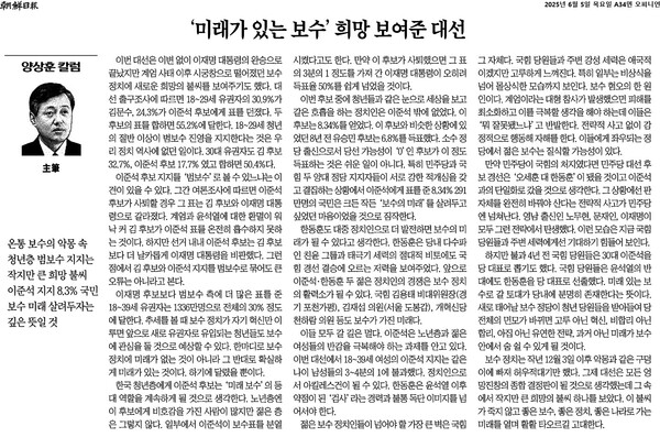 다음 날에 나온 양상훈 주필의 칼럼은 말 그대로 ‘조선일보의 정신 승리’로 채워져 있습니다. 이변 없이 이재명 대통령의 완승으로 끝났지만, ‘미래가 있는 보수’라는 희망을 보여준 선거이기도 했답니다. 대선 출구조사를 보면, 김문수 후보와 이준석 후보를 지지한 20-30대 유권자들이 절반을 넘은 걸로 나왔는데 그것이 희망을 보여준 거랍니다. 이준석은 한국 청년들에게 ‘미래 보수’의 등대 역할을 계속하게 될 거랍니다. 물론, TV토론에서 이준석 후보가 입에 담을 수 없는 저질 발언을 했고 국회의원 제명 청원이 줄을 잇고 있다는 건 말하지 않습니다. ‘할 말은 하는 조선일보’이지만, 그런 말은 하지 않습니다.