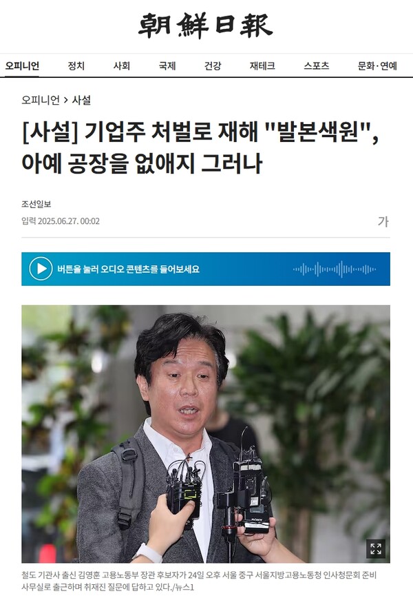 방씨조선일보는 노동부 장관은 노사 양쪽의 균형을 잡고 노사가 상생할 수 있는 방향으로 노동 정책을 수립하고 집행해야 하는 자리란다. 노동계의 목소리를 일방적으로 대변하라는 자리가 아니란다. 사실 여부를 차치하고 역대 노동부 장관이 노사가 상생할 수 있는 방향으로 정책을 펼쳐왔는지 돌아볼 일이다. 윤석열 내란 세력이 건설노동자를 건폭으로 몰아칠 때 노동부의 입장은 엄정 대응을 가장한 노조 탄압이었다. 방씨조선일보는 건설노동자 양회동 열사가 노동자 탄압에 죽음으로 항거했을 때조차 분신 방조와 유서 조작 의혹 등을 날조하는 비인간적 범죄 행각을 벌였다.
