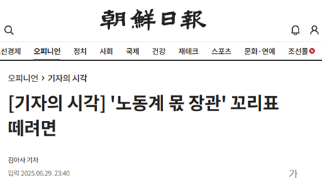 6월 29일에는 ‘노동계 몫 장관 꼬리표 떼려면’이라는 제목의 김아사 씨의 기사가 떴다. 역시 방씨조선일보 종업원다운 발상이다. 노동부 장관은 노동계에서 맡는 것이 당연하다. 따라서 노동계 몫에 맞게 정책을 펼쳐야 한다. 노동계 몫 장관이라는 꼬리표를 떼려고 애쓸 것이 아니라 오히려 노동계를 위해 일하고 있음을 당당히 알려야 한다.