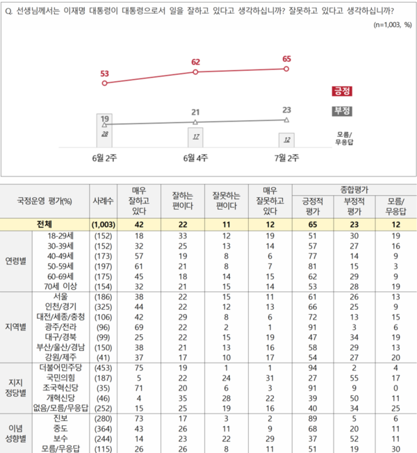 이재명 대통령의 국정운영에 대해 ‘잘하고 있다’(매우+잘함)라는 긍정적 평가는 65%, ‘잘못하고 있다’(매우+못함)라는 부정적 평가는 23%로 조사됐다(모름/무응답 12%). 2주 전 조사(6월 4주)보다 긍정적 평가는 3%p 올랐고 부정적 평가는 2%p 내린 것이며, 취임 직후 6월 2주 대비 긍정적 평가가 12%p 오른 것이다.