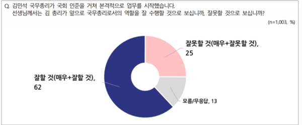 김민석 국무총리가 업무 수행을 ‘잘할 것이다’(매우+잘할 것)라는 응답이 62%, ‘잘못할 것이다’(매우+잘못할 것)라는 응답이 25%였다. 더불어민주당 지지층(n=453)과 조국혁신당 지지층(n=35)에서는 긍정적 기대가 90%를 상회한 반면, 국민의힘 지지층(n=187)에서는 긍정적 기대(25%)에 비해 ‘잘못할 것이다’(매우+잘못할 것)라는 응답(60%)이 우세했다.