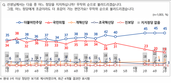 정당지지도는 ‘더불어민주당’ 45%, ‘국민의힘’ 19%, ‘개혁신당’ 5%, ‘조국혁신당’ 3%, ‘진보당’ 1% 등의 순으로 나타나(없다+모름/무응답 등 ‘태도유보’ 25%). 지난 조사에서는 국민의힘 지지율이 20%를 턱걸이했다.
