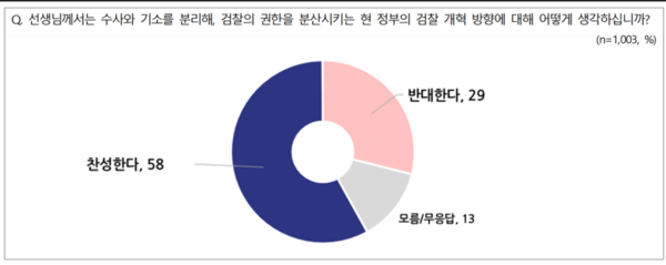 검찰개혁 방향: 찬성(58%)이 반대(29%) 보다 두 배 높아