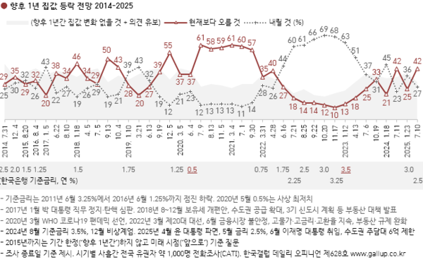 2020년 여름부터 60% 안팎으로 고공 행진하던 집값 상승론은 2022년 3월 대선 직후 급감, 한동안 하락론이 70%에 육박했으나 그해 가을 기류가 달라졌다. 윤석열 정부 출범 후 부동산 관련 규제가 대폭 완화됐고, 이듬해인 2023년 다시 집값 상승론이 늘었다. 그러다 2023년 가을 가계부채 규모가 급증하고 연체율이 상승하자 50년 만기 주택담보대출 판매를 중단하는 등 대출 규제를 다시 강화했다. 2024년에는 다주택자 중과세 폐지, 30년 이상 노후주택 안전진단 면제 등 부양책, 스트레스 DSR 시행 연기 등이 맞물려 불안정성이 커졌다.