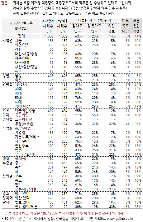 이재명 대통령이 현재 대통령으로서의 직무를 잘 수행하고 있다고 보는지 물은 결과(2점 척도, 재질문 1회), 63%가 긍정 평가했고 23%는 부정 평가했다. 14%는 의견을 유보했다. 지난 주 조사에서는 65%, 6월 4째주 취임 후 첫 조사에서는 64%였다.