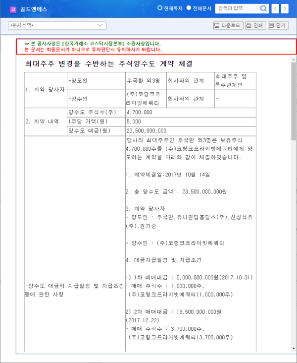 이런 상황에서 코링크와 두 번째로 매각 계약을 맺은 것인데, 이번 계약에서는 주당 5,000원으로 도리어 인수가가 시가보다 높았다.