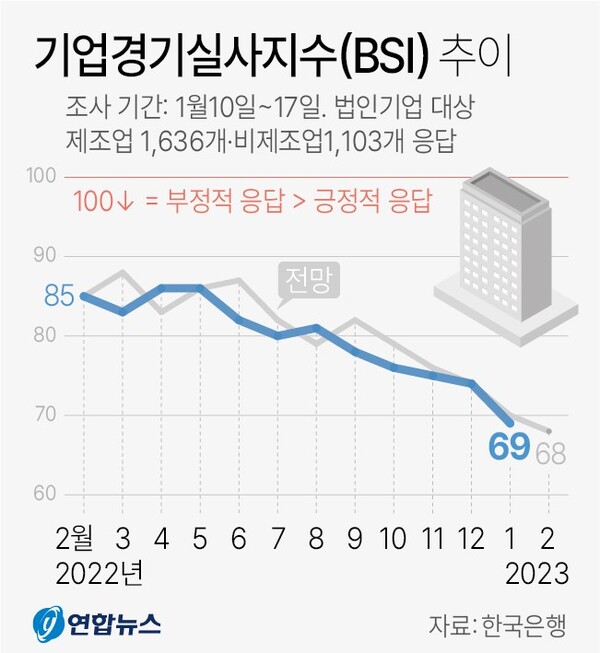 한국은행이 27일 발표한 '1월 기업경기실사지수(BSI)' 조사 결과에 따르면 이달 모든 산업의 업황 BSI는 지난해 12월(74)보다 5포인트(p) 떨어진 69로 나타났다. 이는 지난 2020년 9월(64) 이후 2년 4개월 만에 가장 낮은 수준이며, 지난 2020년 3월(-11포인트) 이후 월간 하락 폭이 가장 컸다.