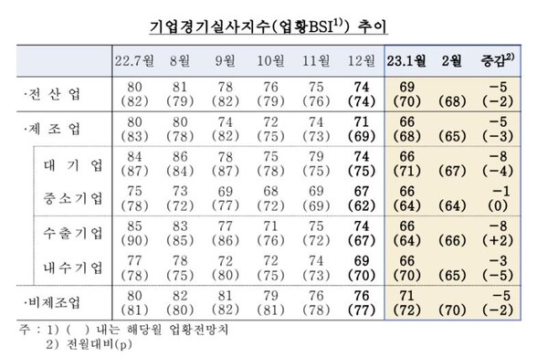 2월 업황에 대한 전망 BSI 지수(68)도 한 달 새 2포인트 하락했다. 제조업(65)에서 3포인트, 비제조업(70)에서 2포인트 낮아졌다.