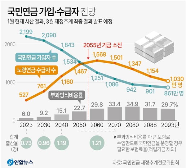합계출산율이 하락하고 기대수명이 증가함에 따라 국민연금 가입자 감소 및 수급자 증가로 보험료 수입 감소, 급여지출 증가가 예상된다. 65세 이상 인구 대비 노령연금 수급자 비율은 올해 44.0%에서 2070년에는 84.2%에 이를 것으로 예상된다.