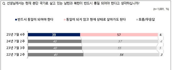 엠브레인퍼블릭·케이스탯리서치·코리아리서치·한국리서치 등 4개 회사가 번갈아 조사하는 전국지표조사(NBS)가 7월 21~23일(3일간) 전국 만 18세 이상 남녀 1001명을 대상으로 전화면접방식(표본오차: 95% 신뢰수준에서 ± 3.1% point, 응답자 이념성향: 진보 285명 중도 377명 보수 243명, 기타 자세한 사항은 중앙선거여론조사심의위원회 홈페이지 참고)으로 우리 국민의 통일 인식을 조사한 결과, 남북이 ‘통일이 되지 않고 현재 상태로 살아도 된다’는 응답이 57%로 절반을 넘고 ‘반드시 통일이 되어야 한다’는 응답은 39%로 나왔다. 이 수치는 지난해 7월과 같은 것이며 2023년 7월에는 55%-40%, 2022년 7월에는 56%-41%를 기록했었다.