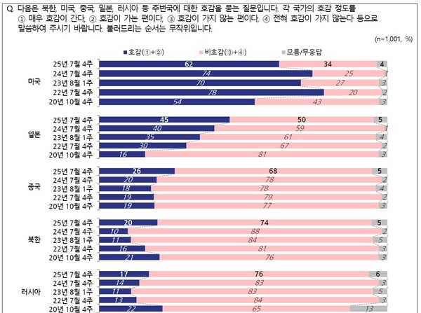 주변국 호감도 미국 62%, 일본 45%, 중국 26%