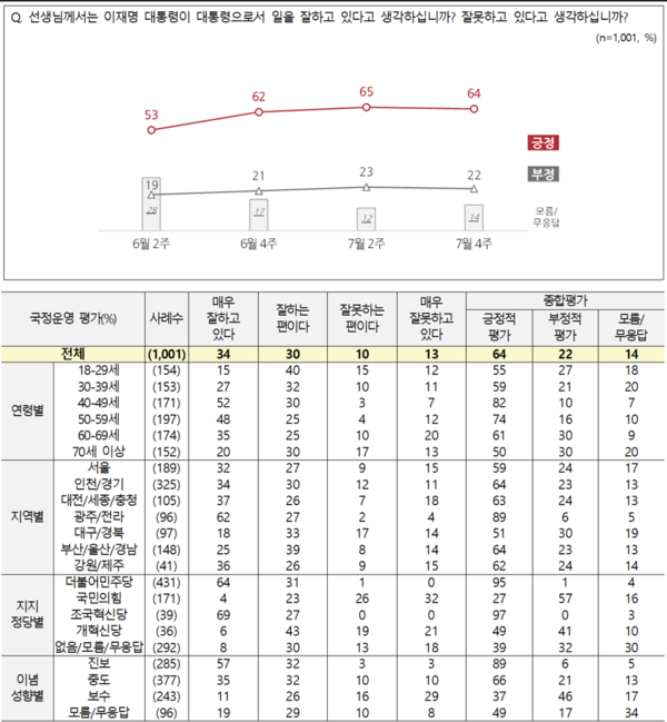 이재명 대통령의 국정운영에 대해 ‘잘하고 있다’(매우+잘함)라는 긍정적 평가는 64%, ‘잘못하고 있다’(매우+못함)라는 부정적 평가는 22%로 조사(모름/무응답 14%)돼 7월 2주 조사와 유사한 양상을 보였다. 이 대통령의 국정운영에 대해 ‘신뢰한다’(매우+신뢰함)는 응답은 64%, ‘신뢰하지 않는다’(전혀+신뢰하지 않음)는 응답은 28%였다.