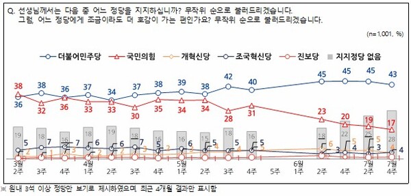 끝없는 국힘당 지지율 하락, 또 최저치 17% 기록