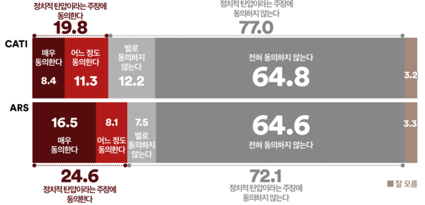 같은 기간에 진행한 ARS조사(응답자 이념성향: 진보 315명, 중도 409명, 보수 210명) 결과에서도 유사한 경향을 보였다. 윤석열의 주장에 ‘동의한다’는 응답이 24.6%, ‘동의하지 않는다’는 응답이 72.1%로 나타났다. 두 응답 간 격차는 47.5%p에 달했다.