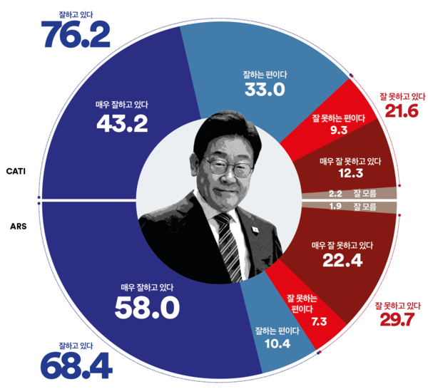 이재명 대통령의 국정운영 평가에서 전화면접조사 기준 ‘긍정’평가는 76.2%, ‘부정’평가는 21.6%로 집계되었으며, ‘긍·부정’ 격차는 54.6%p에 달했다.
