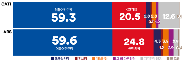 같은 기간에 진행된 ARS조사에서, ‘더불어민주당’은 59.6%(2.1%p↓)를 기록했다. ‘국민의힘’은 24.8%(0.1%p↑)로 집계되었으며, 양당 간 격차는 34.8%p로 나타났다.