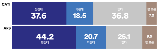 같은 시기에 진행한 ARS조사 결과에서도 ‘정청래’는 44.2%, ‘박찬대’는 20.7%로 23.5%p의 격차를 보이며 모든 권역, 모든 연령대, 남녀 모두에서 ‘정청래’가 우위를 유지했다. 지난 조사에서 ‘박찬대’가 소폭 앞섰던 30대 이하 연령층에서도 ‘정청래가’ 오차범위 안에서 소폭 앞섰다.