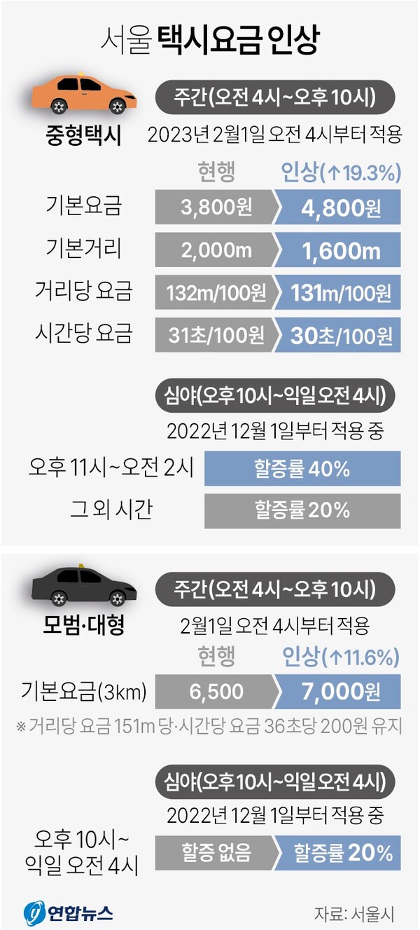 이에 따라 2월부터 심야에 종각역에서 강남역까지 약 10㎞를 이동한다면 택시비를 1만 7700원 내야 한다. 현재(1만 5800원)보다 1900원(12.0%), 심야할증 조정이 없던 작년 12월 이전(1만 3700원)과 비교하면 4000원(29.2%) 인상되는 셈이다.