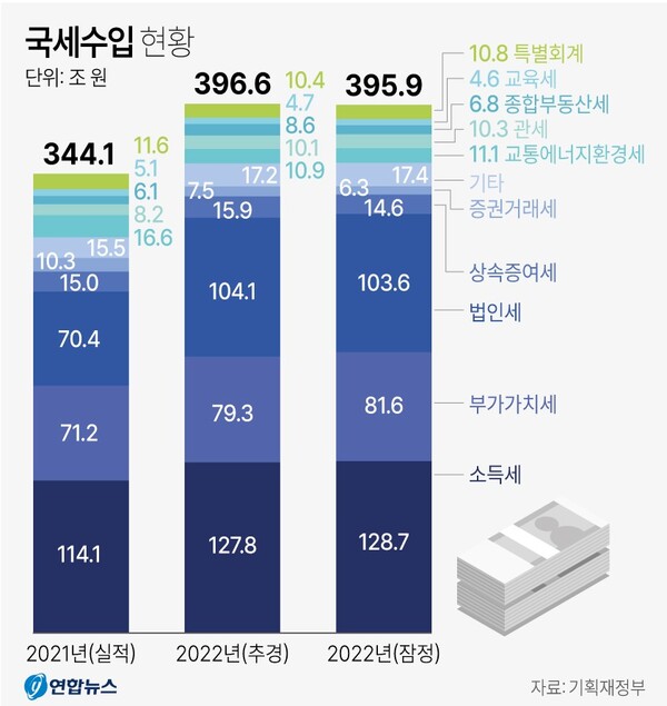 기획재정부가 30일 발표한 2022년 국세수입 실적(잠정)에 따르면 지난해 연간 국세수입은 395조 9000억원으로 전년보다 51조 9000억원 증가했다.