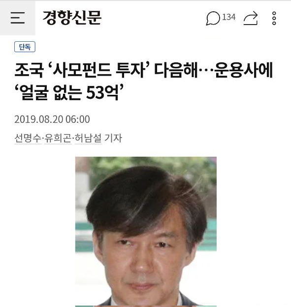 이 기사가 더더욱 괘씸한 것은, 기사 제목에는 “얼굴 없는 53억”이라고 써놓고는 기사 내용이 나오기도 전에 대뜸 조국 전 장관의 ‘얼굴’부터 건 것이다. 기사 내용에는 가정법을 써놓고는 그와 별개로 기사에 건 사진을 악용해서 조국 전 장관을 지목한 것이다. 이런 식의 기사 구성은 단순한 의혹 제기를 넘어 명백하게 악의적인 음해가 아닐 수 없다.