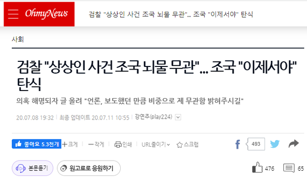 하지만 무려 8개월간의 기나긴 수사 끝에 검찰이 ‘유준원 기소’를 앞세워 조용히 내놓은 진짜 결론은 “조국 연루 의혹은 사실무근”이었다. 언론들 역시 그간 M&A 시장에서 많은 문제를 일으키던 상상인 유준원이 구속 기소됐다는 사실만을 크게 보도하면서 ‘조국은 무관’에는 목소리를 낮췄다. ‘조국 무관’에 주목해 보도한 것은 오마이뉴스 보도 하나뿐이었다. ☞ “검찰 "상상인 사건 조국 뇌물 무관"... 조국 "이제서야" 탄식”