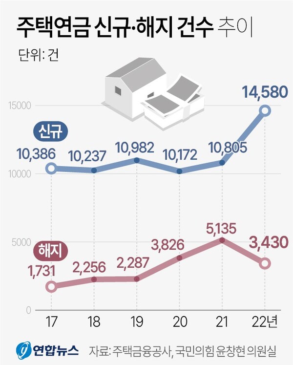 주택연금 해지 건수는 2017년 1731건에서 2018년 2256건, 2019년 2287건에 이어 2020년 3826건, 2021년 5135건으로 급증했다.