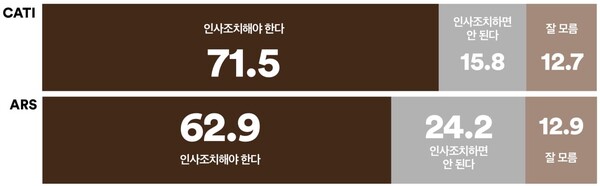 같은 시기에 진행한 ARS조사(응답자 성향: 진보 254명, 중도 433명, 보수 258명)도 유사한 결과를 보였다. ‘인사조치해야 한다’ 62.9%, ‘인사조치하면 안된다’ 24.2%로 두 응답 간 격차는 38.7%p였다. 모든 권역, 모든 연령대, 남녀 모두에서 ‘인사조치해야 한다’는 응답이 우세했다.