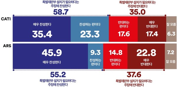 같은 시기에 진행한 ARS조사에서도 유사한 결과가 나타났다. 특별재판부 설치가 필요하다는 주장에 ‘찬성한다’는 응답은 55.2%, ‘반대한다’는 37.6%로 17.6%p의 격차를 보였다.